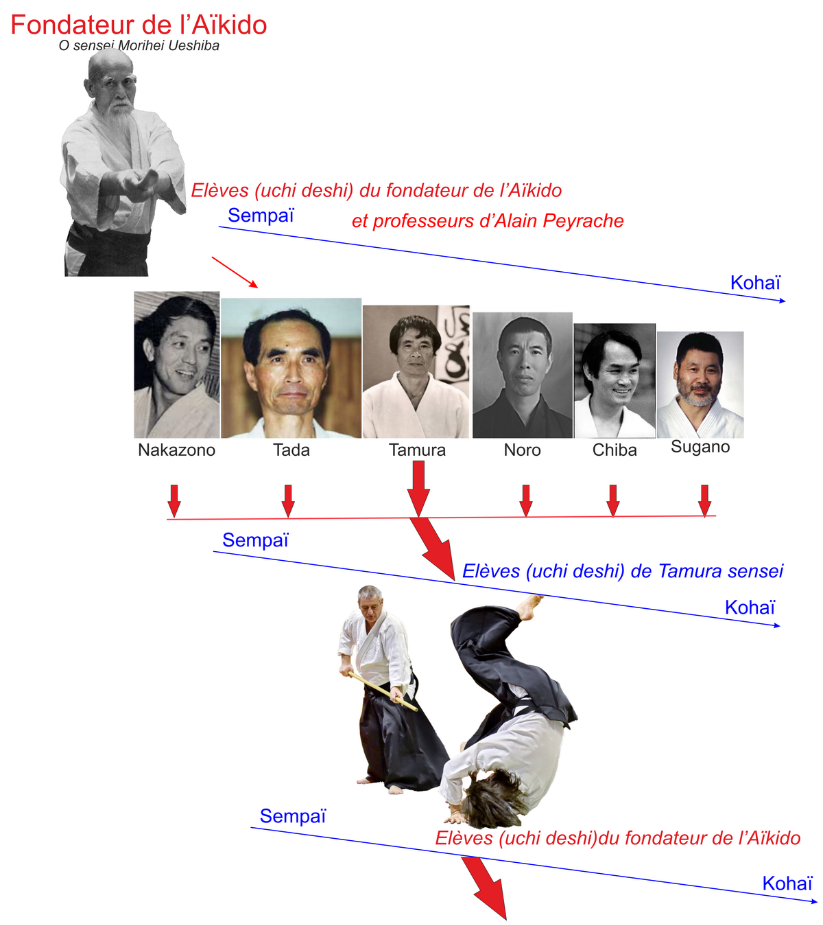 Depuis le Japon jusqu'en Loire-Atlantique, de O'Sensei Morihei Ueshiba (fondateur) à Nobuyoshi Tamura, de Tamura à Alain Peyrache shihan, et enfin d'Alain Peyrache à Hervé Yapo notre sensei.
